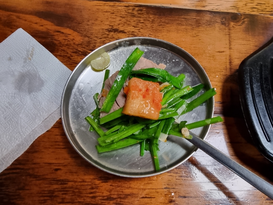 이제 부추를 건저서 고기와 곁들여 봅니다.